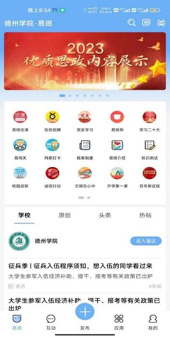 德州学院易班坚持以习近平新时代中国特色社会主义思想为指导,全面贯彻党的二十大精神和习近平总书记关于教育的重要论述,紧紧围绕立德树人根本任务,紧扣铸魂育人主线,充分发挥网络新媒体的信息瞬时传播性、传播形式多元化、灵活互动性等特点,利用网络阵地把思政元素日常化、生活化的融入校园生活,为2023级新生在思想上导航、学习中助力、生活上服务。通过打造“多维度”思政礼包、构建“立体式”网络阵营,精心组织开展新生入学教育工作,将思想政治教育、特色教育、环境适应教育、文明修身教育、国防教育与军事训练等融入新生入学教育全过程,以多维度、立体式育人模式为新生保驾护航。