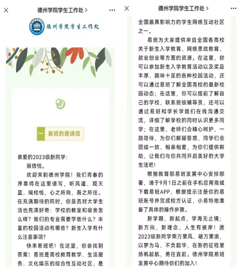 为营造良好的迎新氛围,做好新生入驻易班工作,根据易班共建要求,我校通过“线上+线下”相结合的形式向新生发出易班邀请信。我校共发放纸质版易班邀请信7350份,做到2023级新生全覆盖。同时,通过德州学院公众号、德州学院学生工作处微信公众号、易班社区等平台发布易班邀请信。