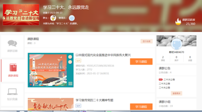 课程内容涵盖以中国式现代化全面推进中华民族伟大复兴、学习宣传党的二十大精神专题等内容。通过课程学习、在线考试等形式丰富学生理论知识。本优课课群活跃度达23360。