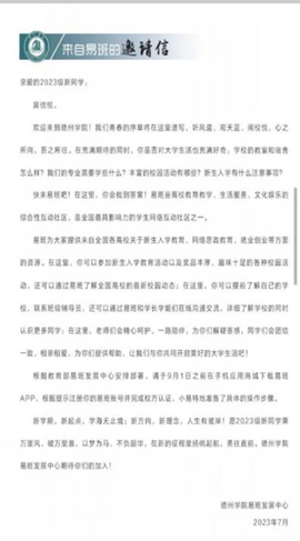 邀请信主要内容包括对易班这一综合性互动社区的总体介绍及影响力、易班在教育教学、生活服务、文化娱乐等方面的功能使用、实名注册易班APP的具体操作步骤等。德州学院2023级新生(含因特殊情况未报到学生)易班APP注册认证率达99.7%。