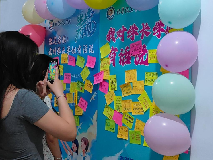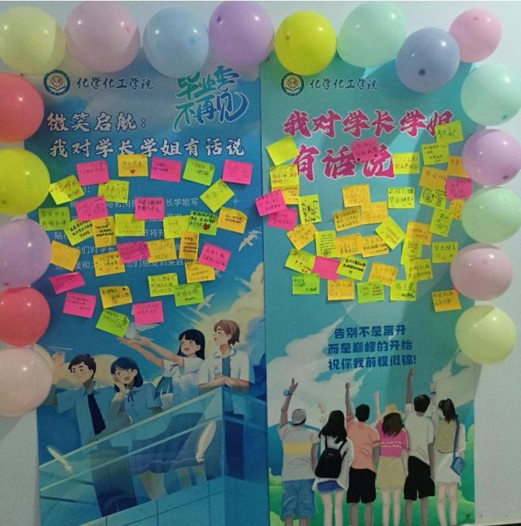 活动现场,化学化工学院精心准备了便签和马克笔,邀请同学们写下对毕业生的祝福语和鼓励话语。内容言辞恳切,表达了对毕业生深厚的不舍与美好的祝愿;有的则发挥创意,用生动的图案传递出对毕业生未来生活的美好期许。同学们纷纷驻足,或沉思或挥笔,将自己的心意化作文字,贴在特制的易拉宝上,形成了一道独特的风景线。现场还准备了开心糖果作为礼物,这份简单而贴心的礼物,不仅让毕业生们感受到了化学化工学院的关怀,也为他们的毕业季增添了一份甜蜜的回忆。活动结束后,易拉宝上贴满了密密麻麻的便签,每一张都承载着同学们的真挚情感。这些祝福和鼓励不仅是一份宝贵的毕业礼物,也将在他们未来的人生道路上,激励他们勇往直前,创造更加辉煌的未来。