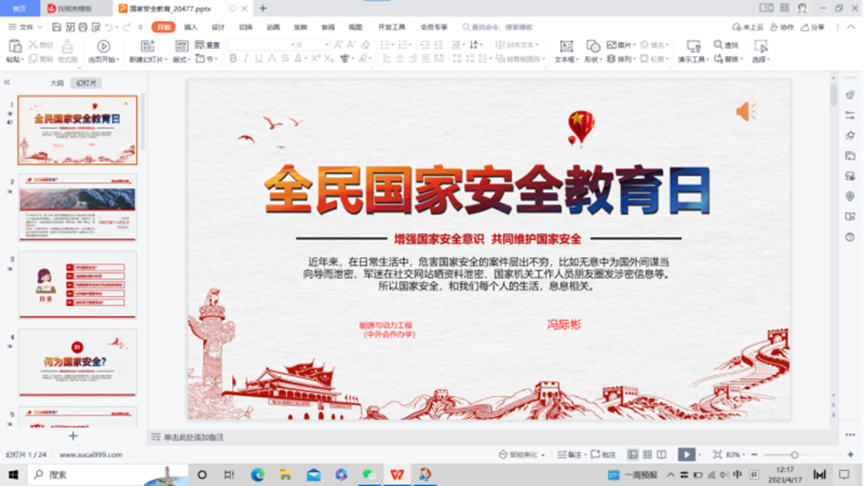 本次活动主要围绕国家安全相关知识展开,主要内容包括国家安全包括的16个方面的基本安全内容及一些危害国家安全的事例,以此来警示大家自觉维护遵守国家安全法。除此之外,能源与机械学院学子以ppt和短视频的形式踊跃参加了此次活动,进一步交流了国家安全的相关知识及自身感悟。
