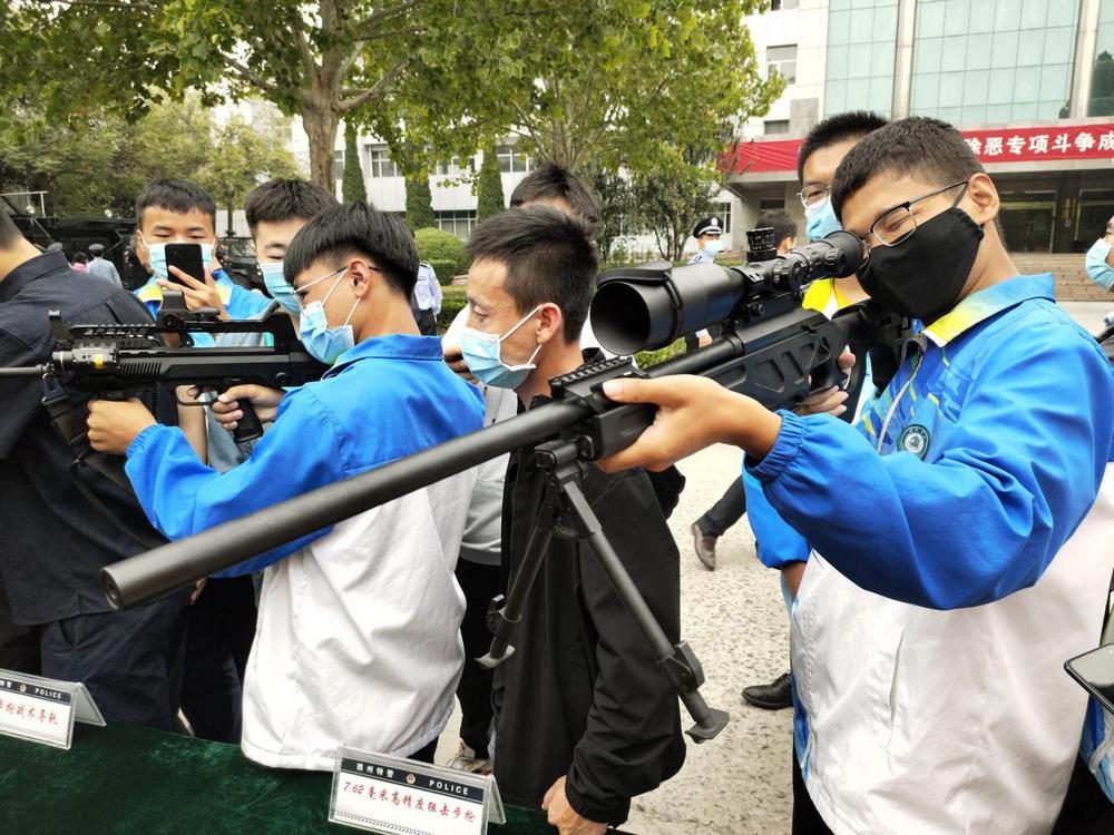 学生们还参观了多功能警车,体验了特警常用的防弹衣、防弹头盔、高精度狙击步枪,95步枪等警用器械和武器,主动与民警们交流互动,开阔了眼界,拉近了与公安民警的距离,提高了反诈骗意识和自我保护意识。