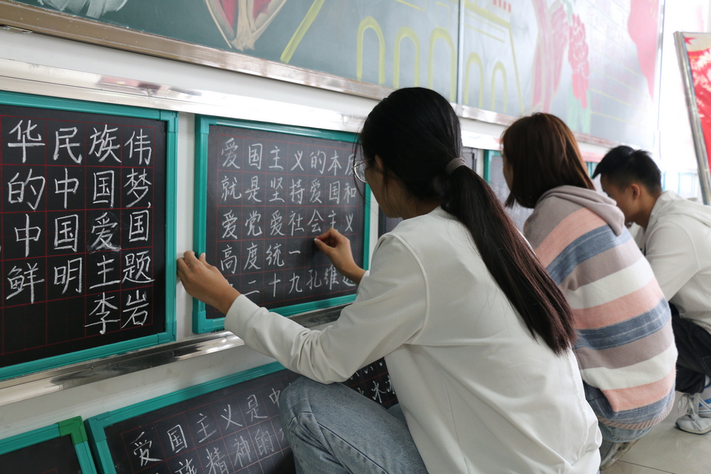 马克思主义学院理论宣讲团带领全体新生参观“庆祝中华人民共和国成立七十周年专题教育展”,讲解新中国71年的历史和抗疫故事,清晰直观地认识新中国的发展与变化,提升专业理论素养;各班级开展“铭记历史”主题班会,同学们纷纷讲述为新中国建设付出鲜血生命、付出巨大牺牲的革命先辈故事,激发爱国热情,感受革命先烈和老一辈革命家的艰辛探索和赤胆忠诚。 “忆红色经典、颂祖国华章”主题朗诵大赛中,《我的祖国》等经典诗歌诠释了当代大学生强烈的爱国主义热情和对祖国母亲的无限眷恋,也激励了青年学生在静好的岁月里,坚定信念,牢记思政课教师使命,以实际行动肩负起时代重任。通过“习语育人”三笔字技能展示活动,将师范生实践技能训练内容与厚植爱国热情相融合,练在日常、学在日常、用在日常,不断深化爱国主义教育,拓宽培养师范生爱国教育精神实践途径,努力培养大学师范生的爱国品德。