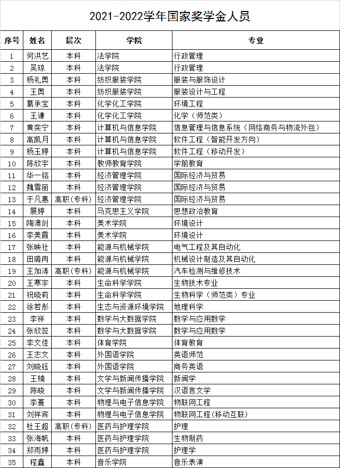 根据山东省教育厅《关于做好2022年奖学金评审发放工作的通知》(鲁教财函〔2022〕91号)、《山东省学生资助资金管理办法》(鲁财科教〔2021〕15号)、《山东省学生资助管理标准》文件精神,德州学院本着公开、公平、公正、择优的原则,经评审委员会审议通过国家奖学金35人。