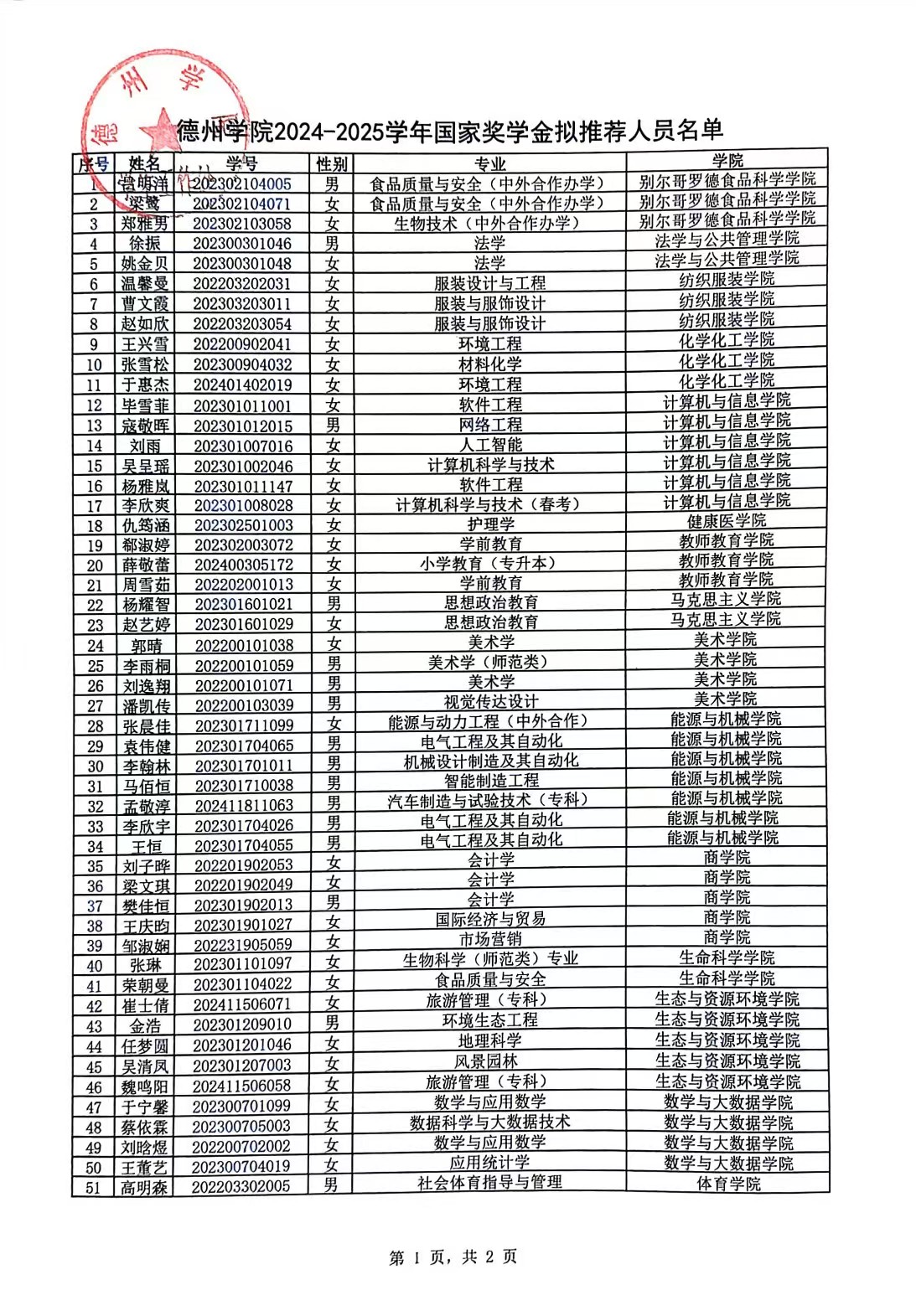 附:德州学院2024-2025学年国家奖学金拟推荐人员名单(按学院排序)