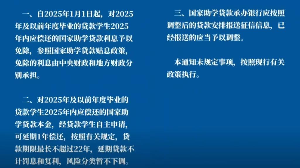 根据《关于做好2025年国家助学贷款免息及本金延期偿还工作的通知》要求,对2025年及以前年度毕业的贷款学生:2025年内应偿还的国家助学贷款利息予以免除(由财政承担);经贷款学生自主申请,本金可延期1年偿还(不计罚息和复利,不影响征信)。