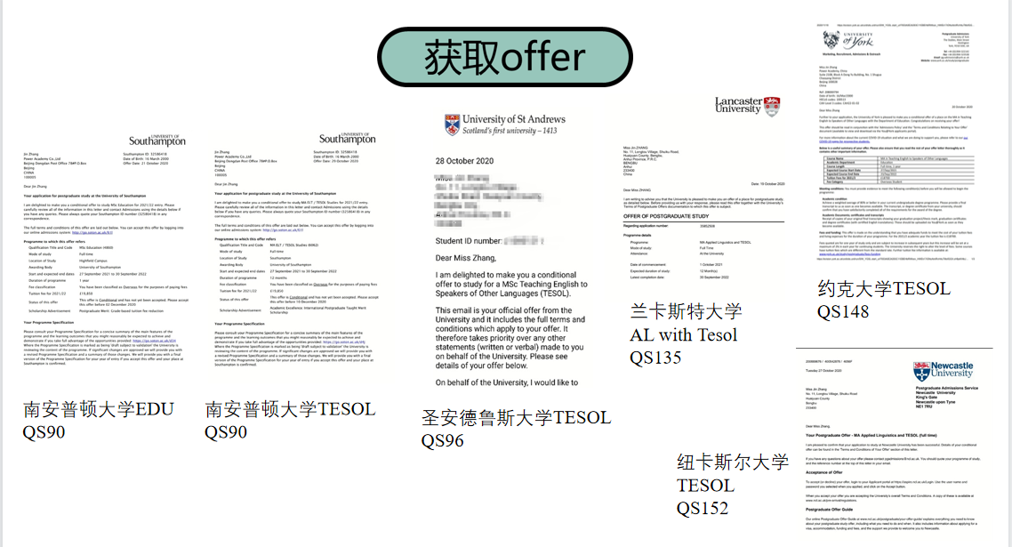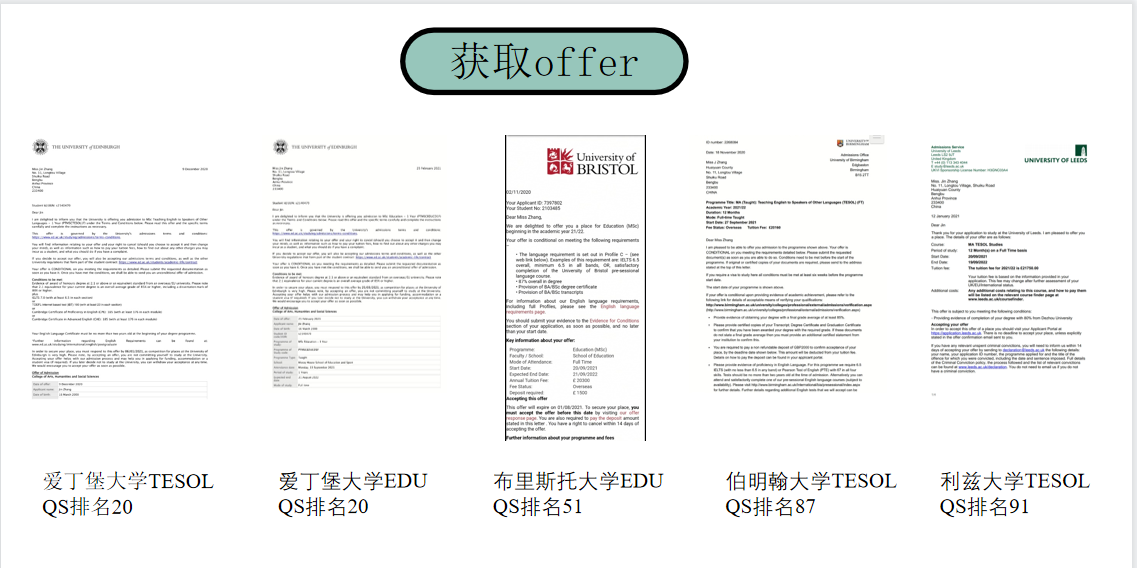 我申请季中获得了9所英国大学的offer。分别是爱丁堡大学、布里斯托大学、伯明翰大学、利兹大学、南安普顿大学、圣安德鲁斯大学、兰卡斯特大学、纽卡斯尔大学、约克大学。我在大二的时候就决定要出国读研究生。和考研不同,申请国外研究生更像是一场持久战,就像一场综合等级评定。英国研究生需要看申请学生前三年的学业成绩、加权绩点、实践经历、获奖情况等等,想要去好学校,就必须要保证学业成绩拔尖。于是我从下定决心的那一刻开始,便开始十分努力地学习,到目前为止,我四年来的绩点是4.04,也就是四年来的成绩是90多分的平均分。努力让我获得了回报,我成功获得了梦校爱丁堡大学的录取。