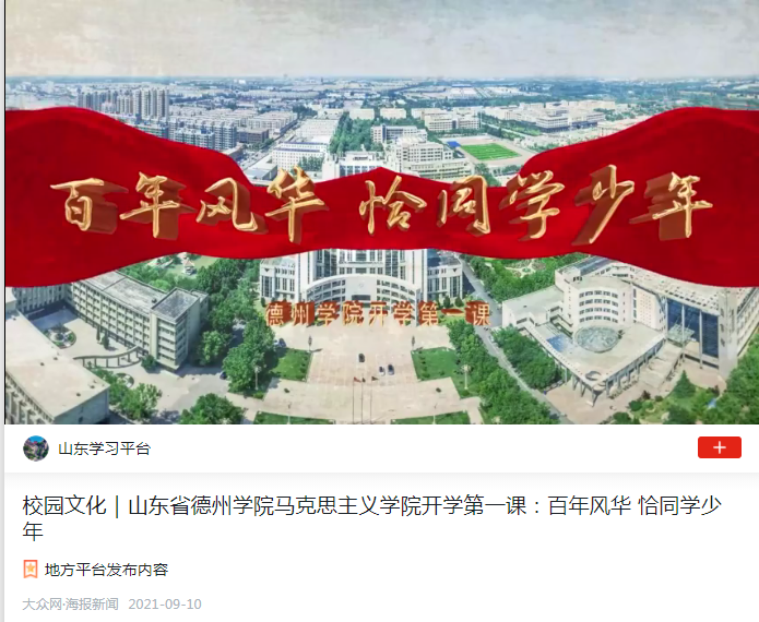 为推动党史进课堂,厚植山东省德州市大、中、小学生爱党爱国情怀,培养一代又一代有志气、骨气、底气的社会主义建设者和接班人,中共德州市委教育工作委员会、德州学院联合大众网·德州,共同推出开学第一课︰百年风华·恰同学少年。近日,我校开学第一课登上了学习强国。